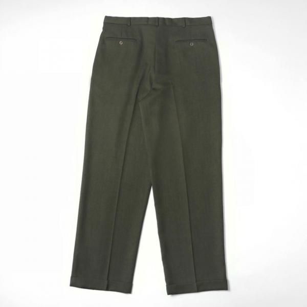 90年代-00年代(2001年製)のアイテムでシルエットはオリジナルフィット、ユッタリとしたツータック入りでややテーパードした感じになります。生地はウーステッドウール混紡、薄めの柔らかい上質な生地感です。