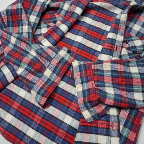 フランネル特有の毛羽立ちと多少の毛玉、品質タグに染み、襟袖の白地に多少の黄ばみ、右肩と右肘の裏側ロック縫いにホツレあり。メイン縫製は良好です。