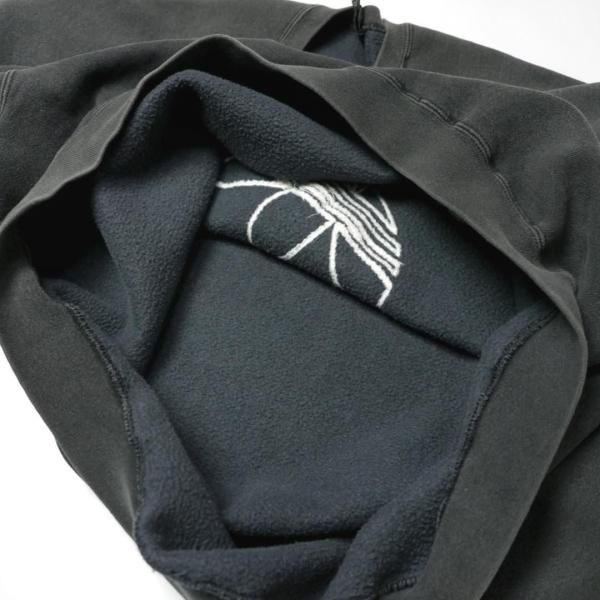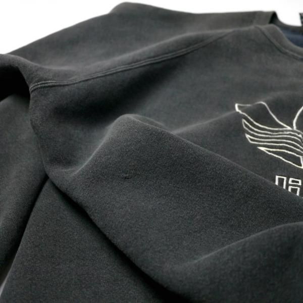 全体的にフェード、アタリ、多少の毛玉と毛羽立ち、刺繍ロゴに若干の擦り切れ、袖先に薄めの小染み、リブに伸び、袖先リブ角付近にわずかな手縫い補修、左裾ロック縫いにステッチ欠損あり。(メイン縫製は良好です)